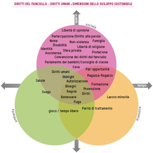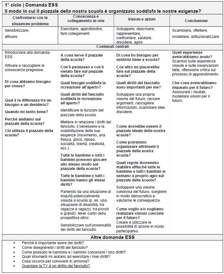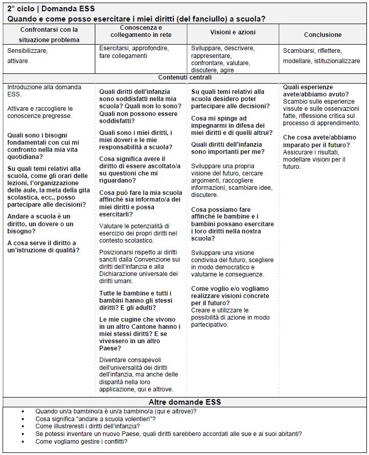 Scoprire i diritti umani e del fanciullo, metterne in discussione l’attuazione e sperimentarli contribuisce ad esercitare numerose competenze ESS: sviluppare la conoscenza di sé, l’autostima e la fiducia in sé stessi; gestire le contraddizioni tra i vari diritti, tra il bisogno di protezione e il desiderio di libertà; elaborare con gli altri misure per preservare e contribuire a configurare l’ambiente che ci circonda; dibattere, tenendo conto delle sfide in gioco e dei limiti inerenti ad una problematica; capire il valore della partecipazione e il significato della democrazia nel contesto della sostenibilità; sviluppare competenze interpersonali come la comunicazione, la collaborazione, il rispetto e l’empatia. In altre parole: prendersi cura di sé stessi, degli altri e dell’ambiente naturale.