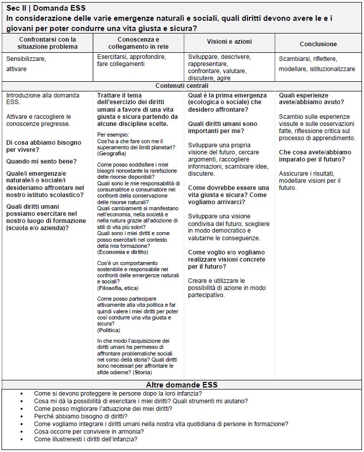 Le domande ESS forniscono alle e agli insegnanti un orientamento per trattare il tema in classe, focalizzandosi sulla sua complessità e pertinenza per la società. Queste domande consentono ad allieve e allievi di confrontarsi le prospettive dello sviluppo sostenibile nel contesto dei diritti del fanciullo e dei diritti umani.