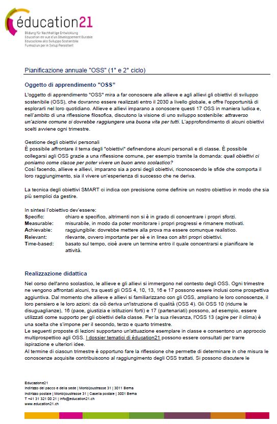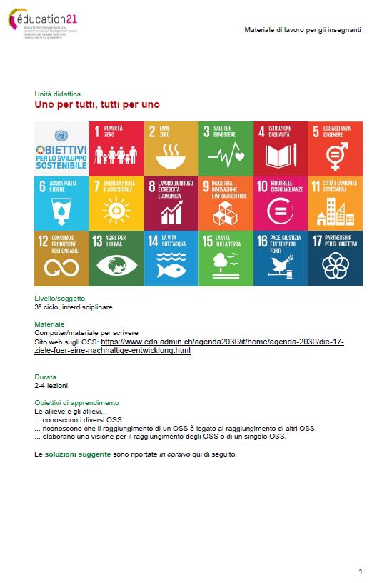 Le spiegazioni che seguono forniscono una breve panoramica degli OSS a livello formale, in modo che il contenuto degli OSS possa essere affrontato a scuola. Le idee per la trasposizione didattica specifica si trovano nei relativi livelli scolastici e quelle più generali (non solo per la classe, ma anche per l’istituto scolastico) nella pertinenza ESS.