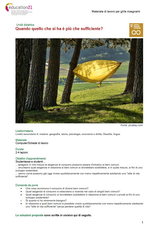 Con questa proposta didattica, gli/le discenti esaminano i consumi e le esigenze di consumo. Grazie alla quale essi saranno in grado di sapere come possono già oggi vivere quotidianamente con meno adottando uno "stile di vita sufficiente".Film