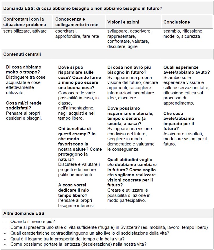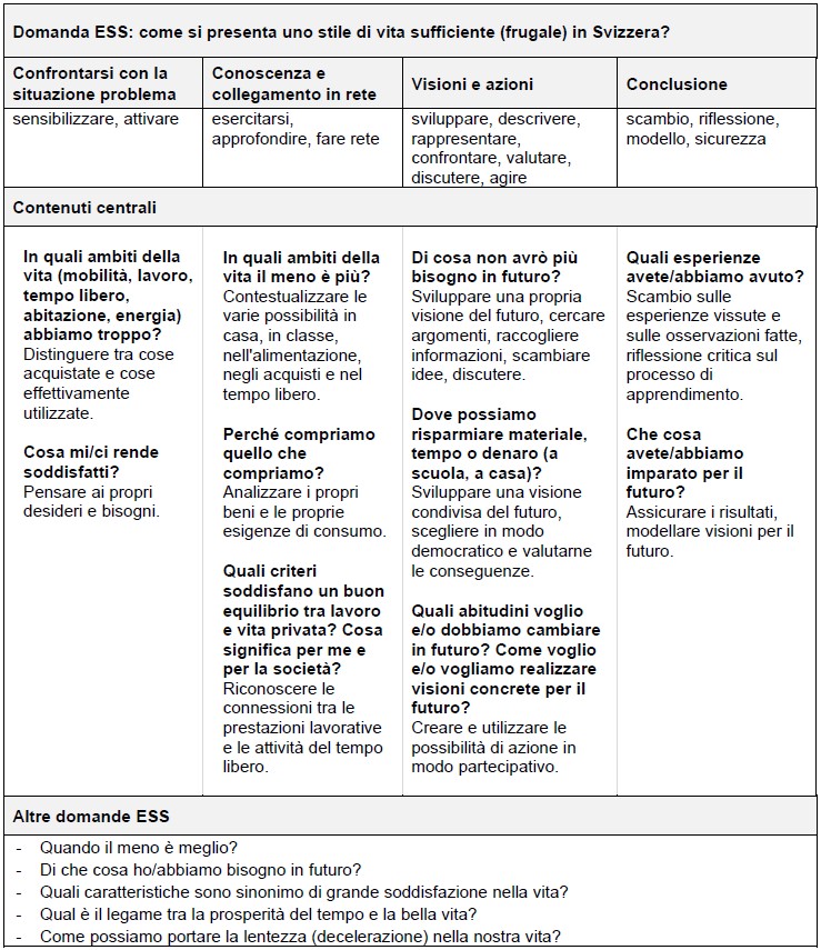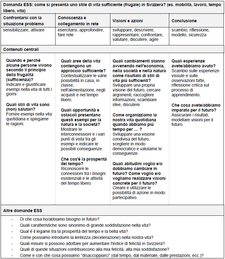La domanda ESS fornisce al corpo docenti delle indicazioni sui possibili contenuti per mantenere al centro dell'attenzione la complessità dell'argomento e la sua rilevanza sociale, consentendo alle allieve e agli allievi di affrontare le questioni dello sviluppo sostenibile nel contesto della “sufficienza - meno è meglio”.