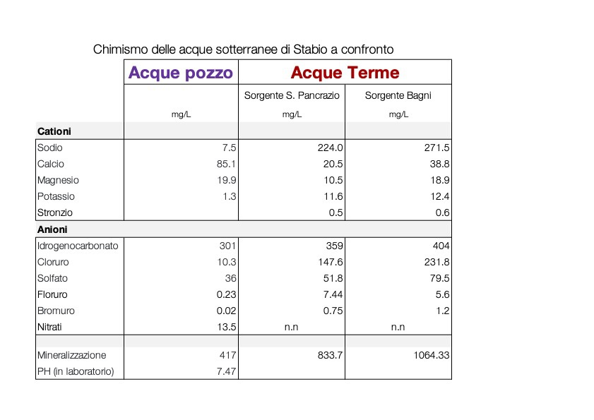 Questa tabella ci aiuta a capire cosa rende tanto particolari queste acque, mettendo a confronto il chimismo delle acque termali con quello delle acque del pozzo comunale.