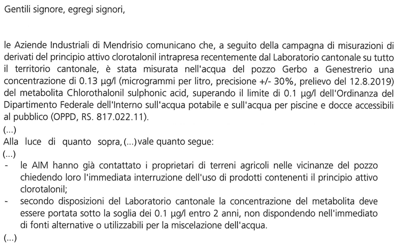 Al pozzo Gerbo di recente si ha avuto una prova evidente degli effetti della chimica di sintesi usata contro i parassiti delle coltura agricole, sulla potabilità delle acque. Il Pozzo Gerbo si trova sul confine occidentale del comune di Stabio. Ecco un estratto di quanto hanno comuicato a tal proposito le Aziende Industriali di Mendrisio: