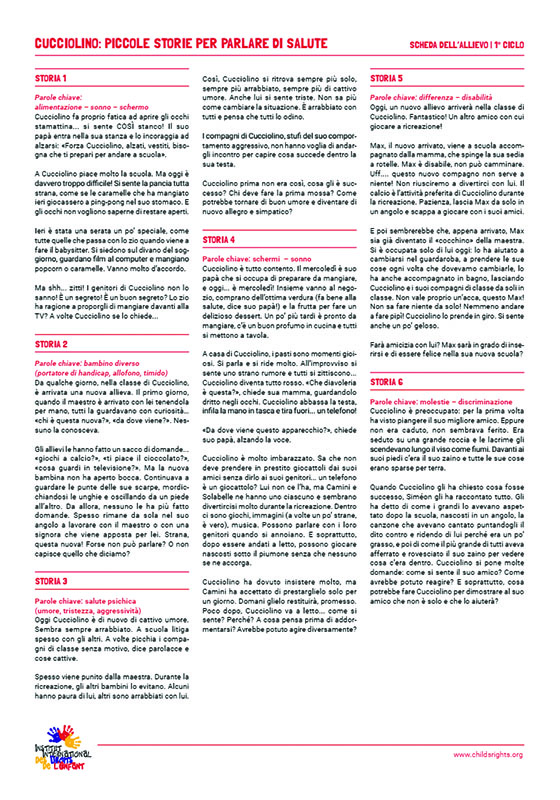 Per il primo ciclo, le attività si basano sulle storie di Cucciolino e sulla realizzazione di un grande fiore ispirato ai diritti del bambino. Vengono proposti diversi ampliamenti (dibattito filosofico, disegno, laboratori di cucina, movimento, rilassamento, coltivazione di una pianta, ...).