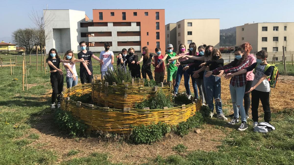 La classe 2D della Scuola media di Stabio (TI) nell'orto didattico (Foto: S. Filimci)